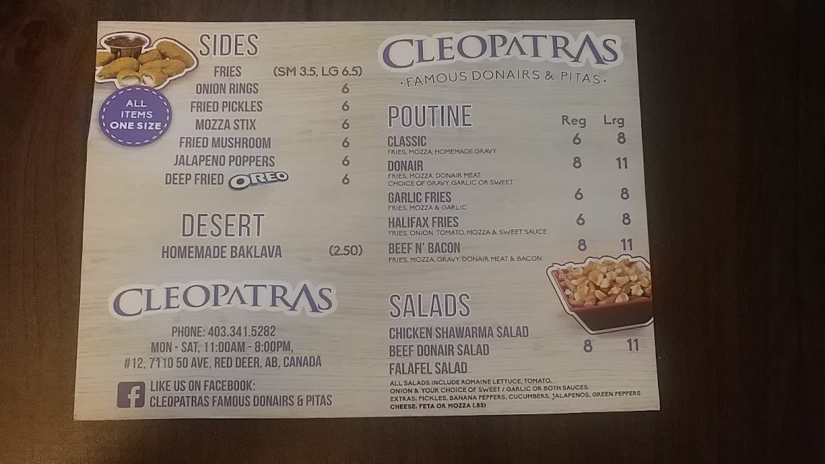 The menu at Cleopatras Famous Donair & Pita offers a straightforward selection of Mediterranean-inspired dishes alongside classic comfort foods, making it a comfortable spot for casual bites or a quick meal on the go. Whether you’re stopping in for a hearty donair wrap or picking up a fresh Greek salad, the choices reflect a balance of satisfying flavors and familiar favorites.